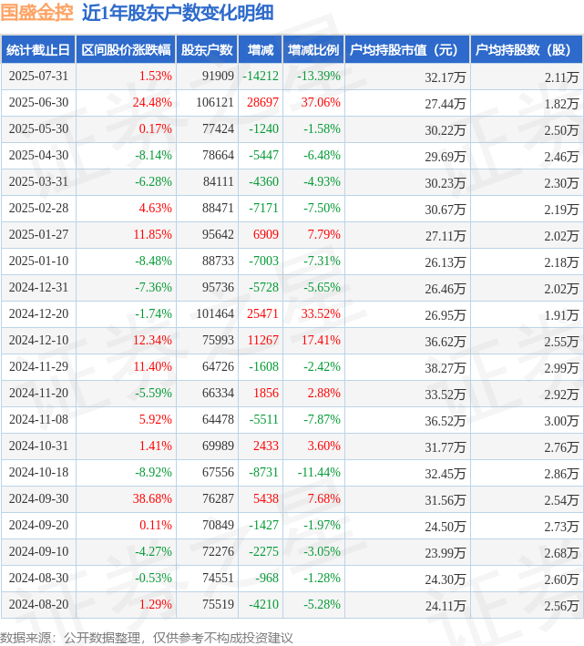 证券之星消息,近日国盛金控披露,截至2025年7月31日公司股东户数为9.19万户,较6月30日减少1.42万户,减幅为13.39%。户均持股数量由上期的1.82万股增加至2.11万股,户均持股市值为32.17万元。